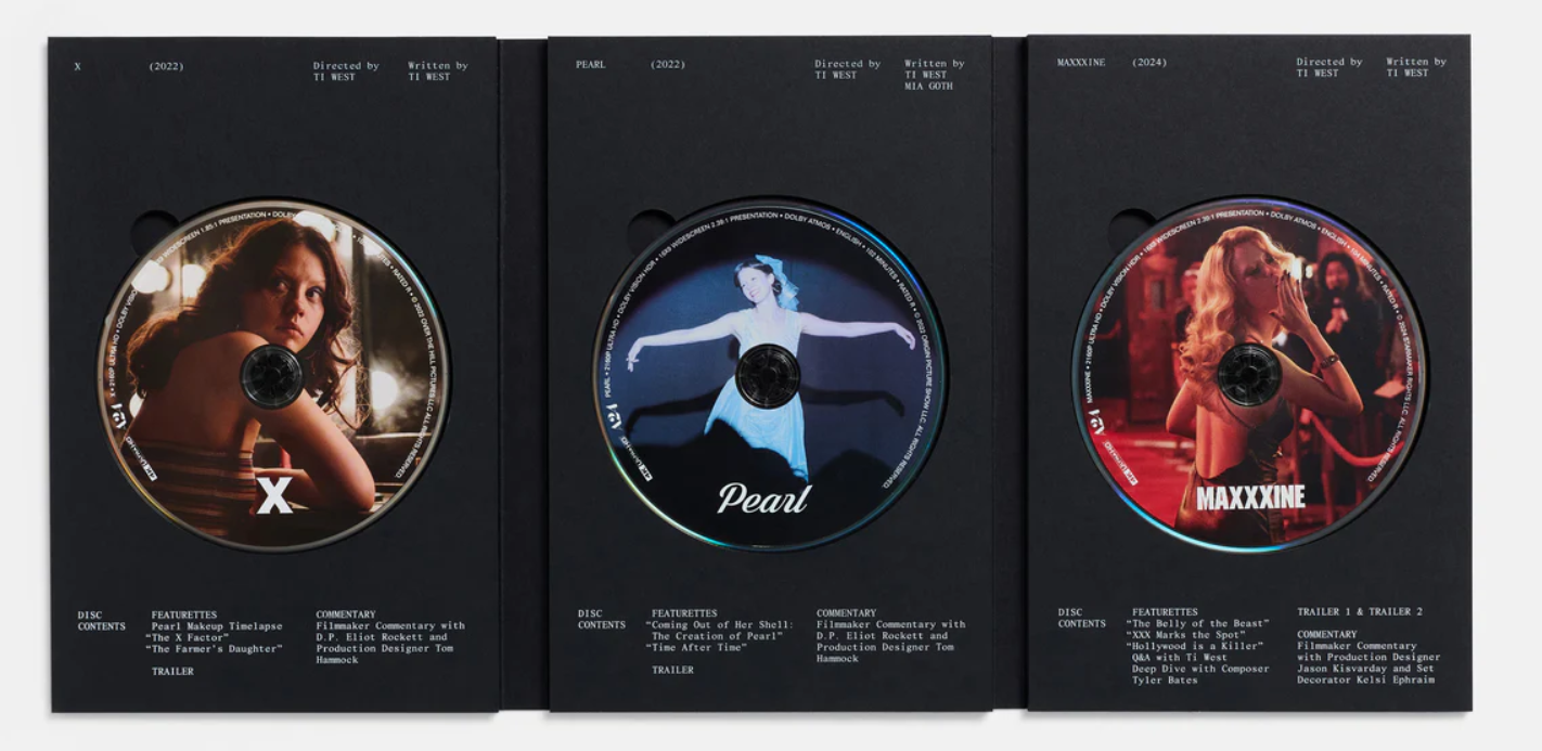 But you also get the movies, of course. Previously released by Lionsgate in the US and VVS Films in Canada – with X and Pearl only available in Blu-ray – they’re now getting the luxe A24 treatment in your choice of 4K or BD. I don’t believe the image has been remastered, but the sound has: All three features now sport Dolby Atmos soundtracks in either format, whereas X and Pearl were originally released on disc with DTS-HD Master Audio.