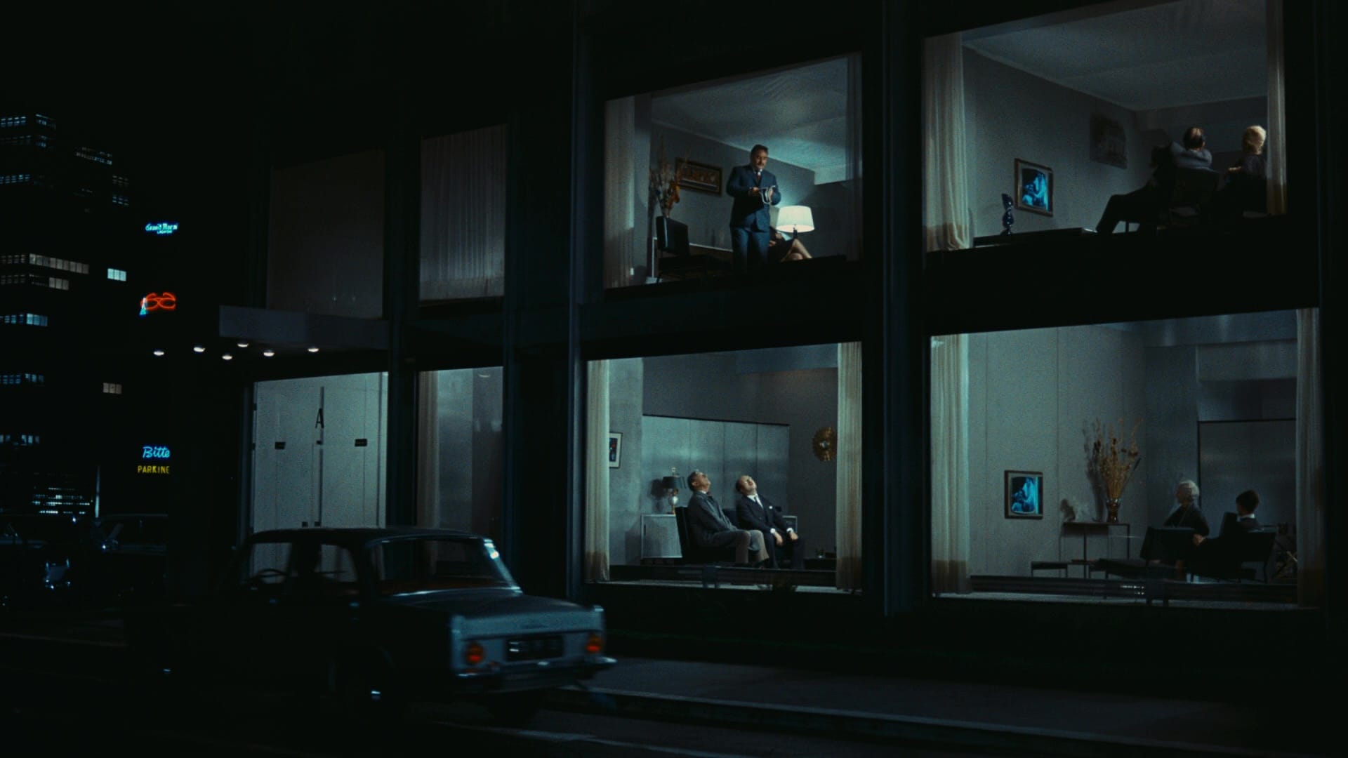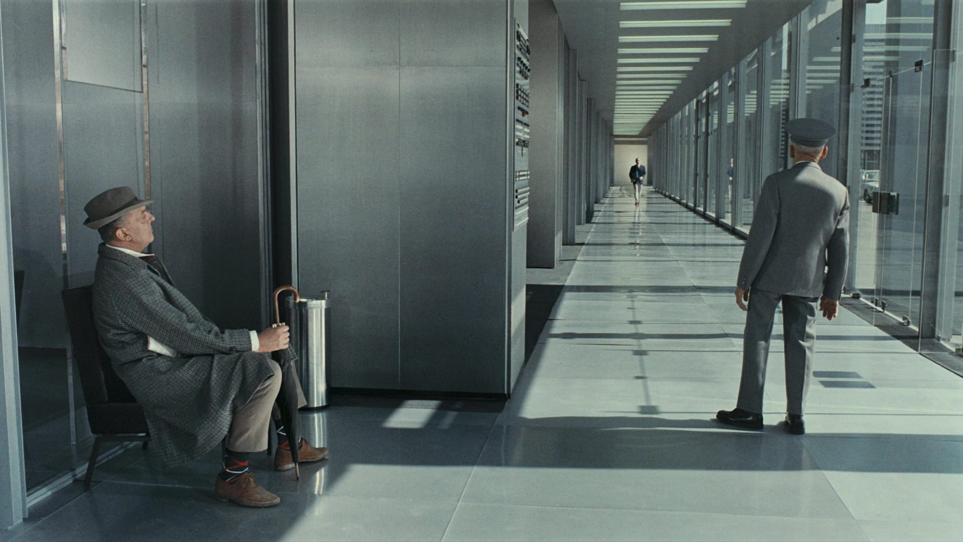 Is PlayTime Tati’s masterpiece? Quite possibly! Some may prefer the simplicity of M. Hulot’s Holiday or the complexity of the car stunts in Trafic, but PlayTime has a delight in its own artifice that feels unique among his films. Mon Oncle flirted with controlled environments by putting Hulot in a fancy futurist community, but he could wander outside; in PlayTime, save for a few key shots, even the outside is inside, to be reorganized or manipulated at the filmmakers’ will.