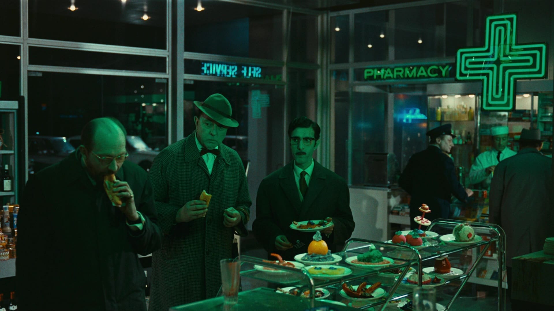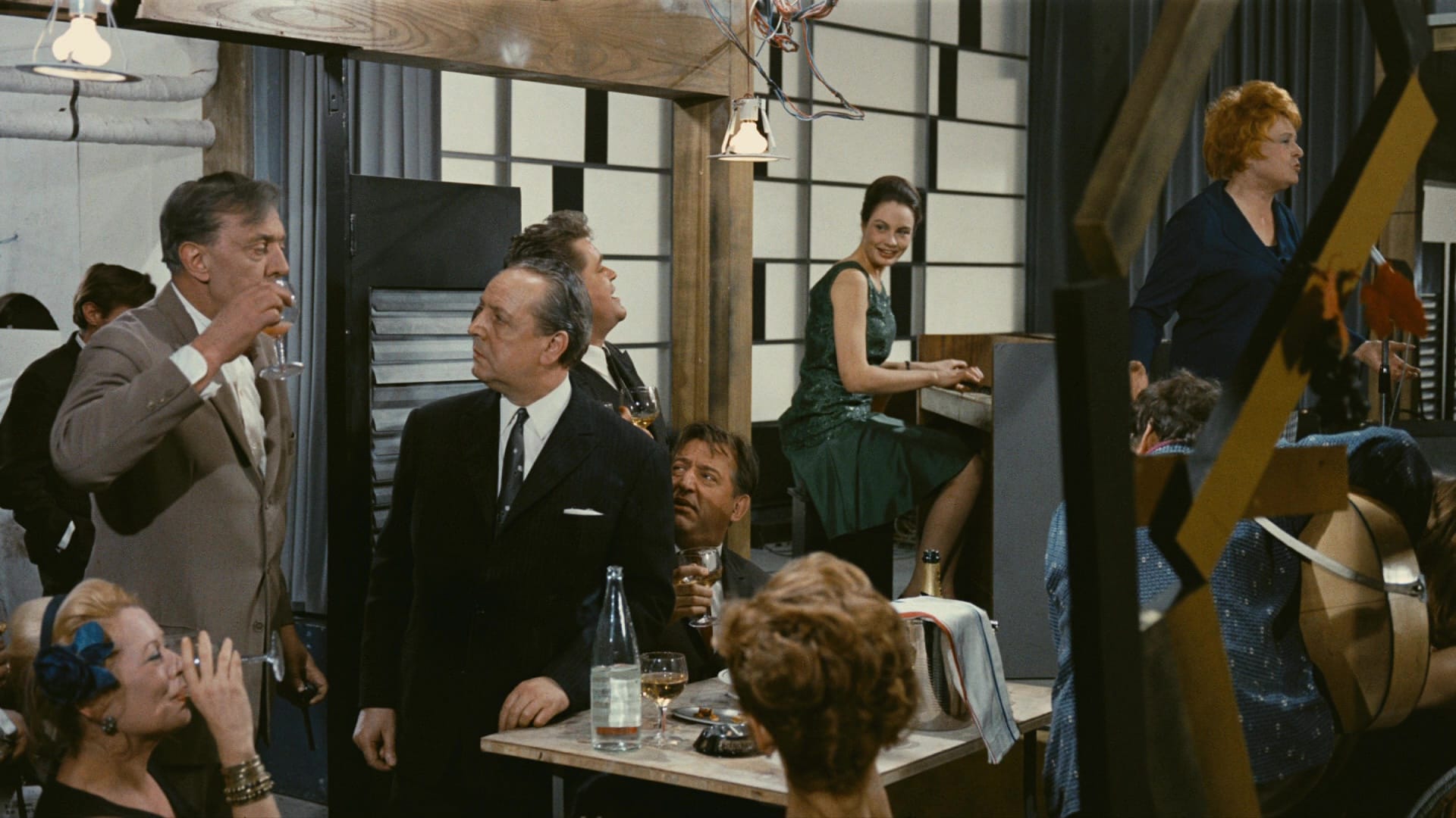 The Royal Garden’s neon sign burns bright red, and there’s a seemingly endless range of grays, blacks and whites in the buildings and offices, and perfectly manicured wardrobes of the various businessmen wandering around. M. Hulot’s slightly tweedy look distinguishes him from the suits, but only to our eyes; everywhere he goes, he’s assumed to be a person of status despite his perpetual state of genial befuddlement.