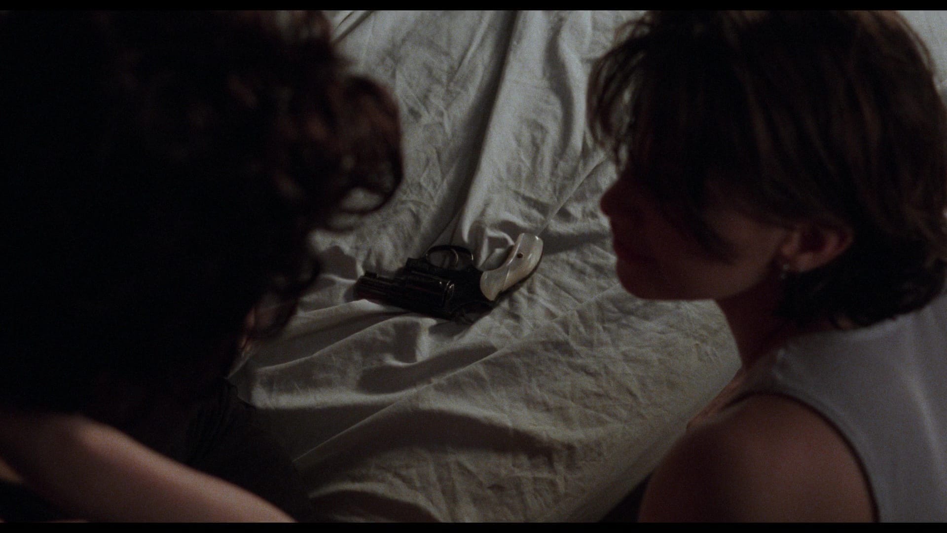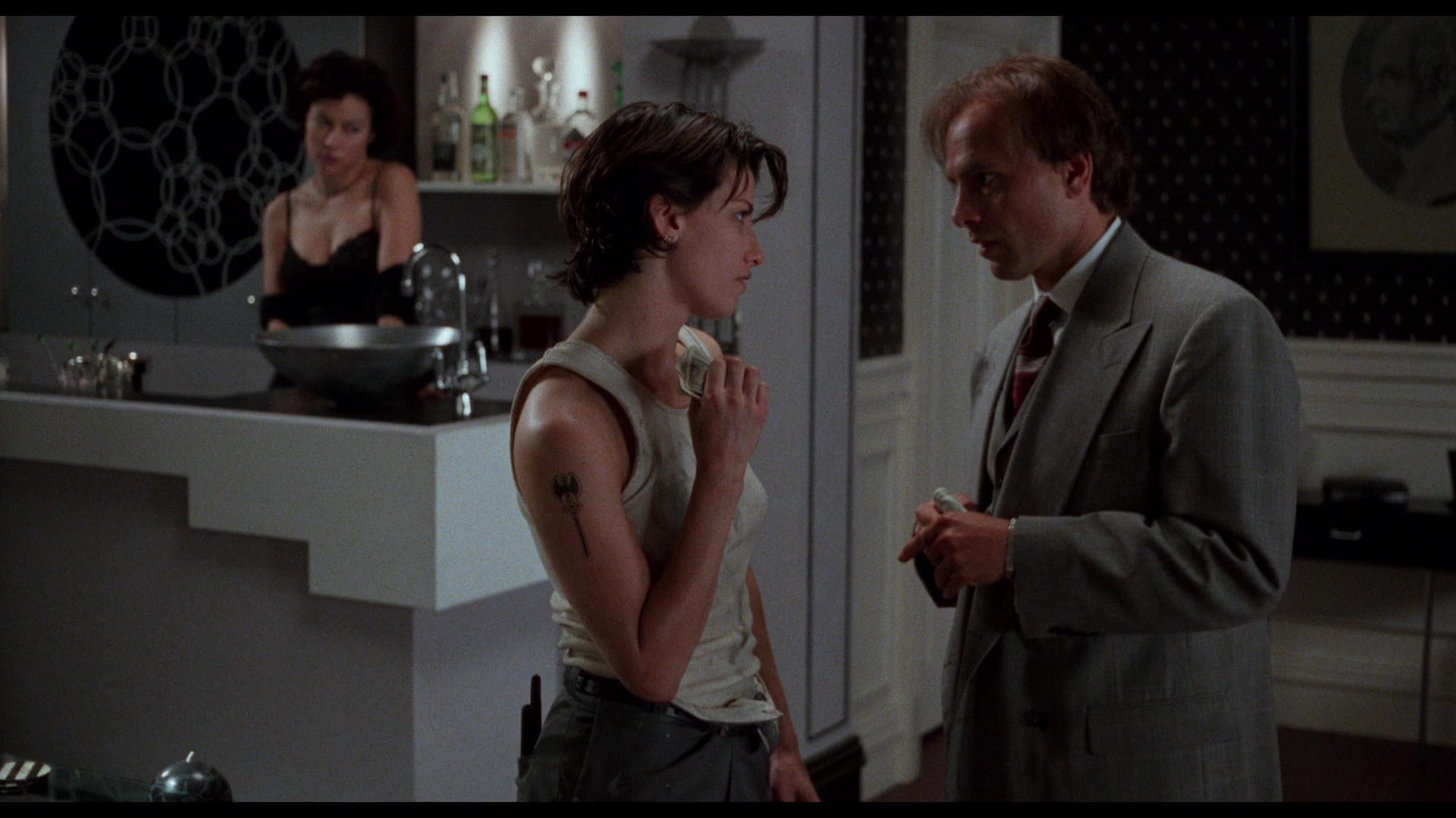 For the supplements, Criterion gathers extras from every previous release of the movie and adds “Pipeline to Seduction”, a video essay from Christina Newland, and a very thoughtful booklet essay by cultural critic McKenzie Wark. The audio commentary was recorded for the LaserDisc, and it’s a really engaging one, assembling the Wachowskis, Gershon, Tilly, Pantoliano, editor Zach Staenberg and technical advisory Susie Bright to discuss every imaginable aspect of the picture. The retrospective featurette “Modern Noir” dates back to Arrow’s 2014 UK special edition, as do the interviews with Gershon and Tilly (paired), Joey Pants and Christopher Meloni; an interview with title designer Patti Podesta and a conversation between critics B. Ruby Rich and Jen Woorman come from Olive Films’ 2018 Signature Edition.