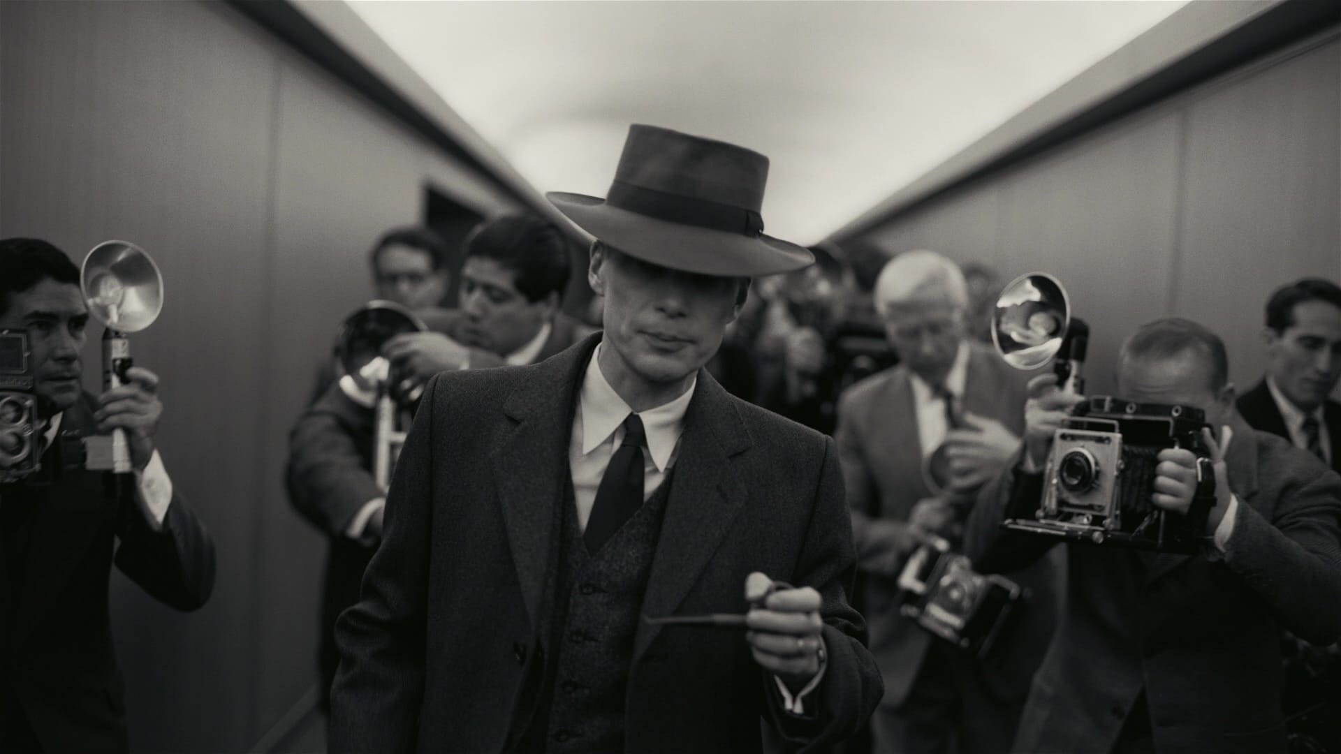 Nolan and cinematographer Hoyte van Hoytema lock us into the headspace of their subject, embodied by Cillian Murphy as a man pre-emptively withered by the karma he’s creating. Or maybe his hollowed look – a literal scarecrow, which may itself be Nolan’s own in-joke – is meant to suggest the radiation poisoning he’s about to inflict on the survivors of Hiroshima and Nagasaki.