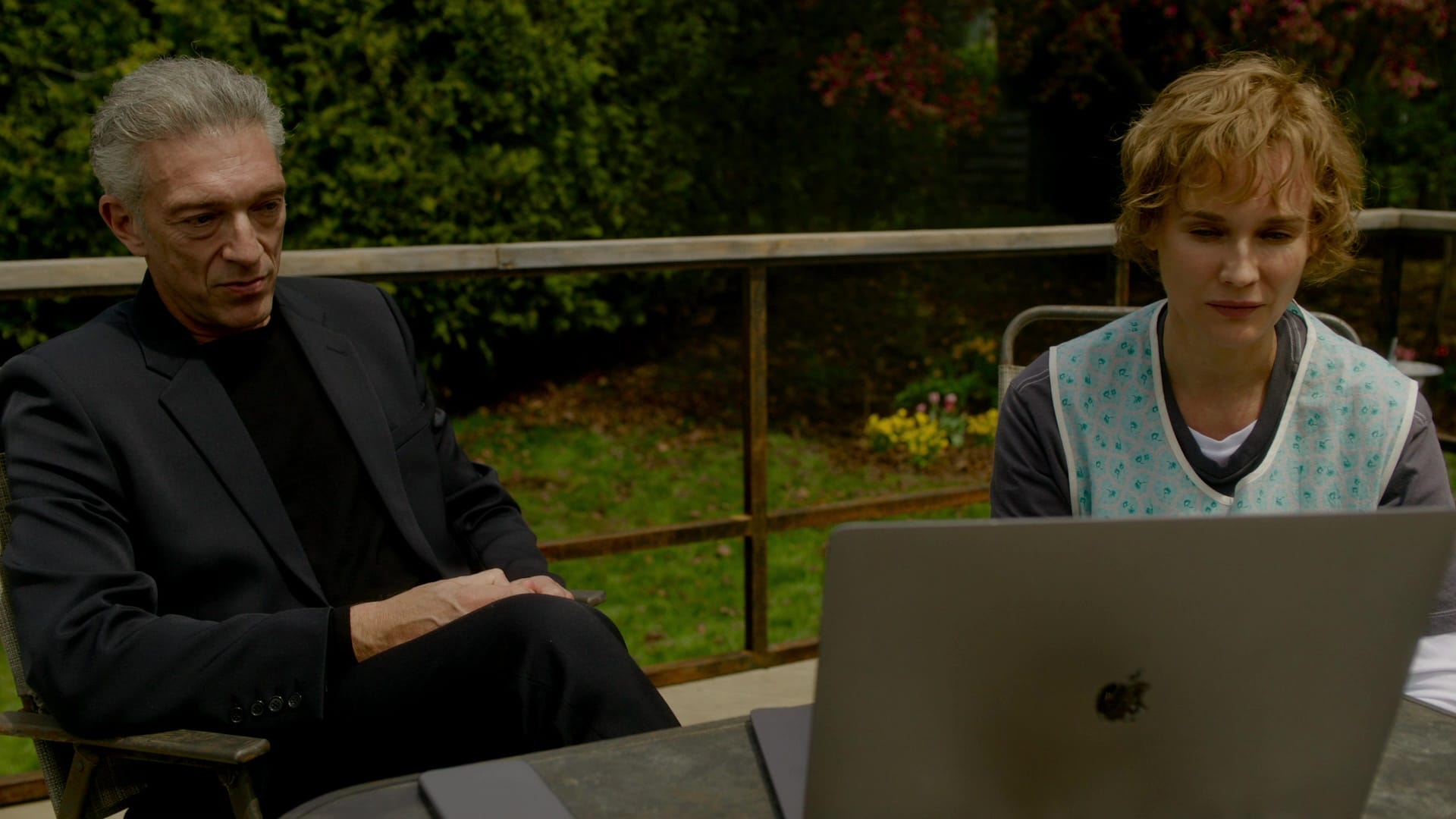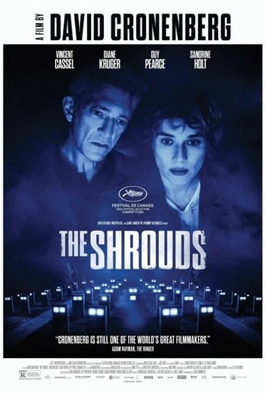 I wrote about this when the film screened at TIFF last fall, and even discussed it with Cronenberg onstage after one of those shows; The Shrouds is a story about a man who throws himself into his art after the death of his wife, and finds that his work won’t save him. In the movie, the artist is Karsh (Vincent Cassell, styled as a dead ringer for Cronenberg), an entrepreneur who responds to losing his beloved Becca to cancer by designing technological cadaver wraps that allow the living to watch their loved ones decompose in real time.