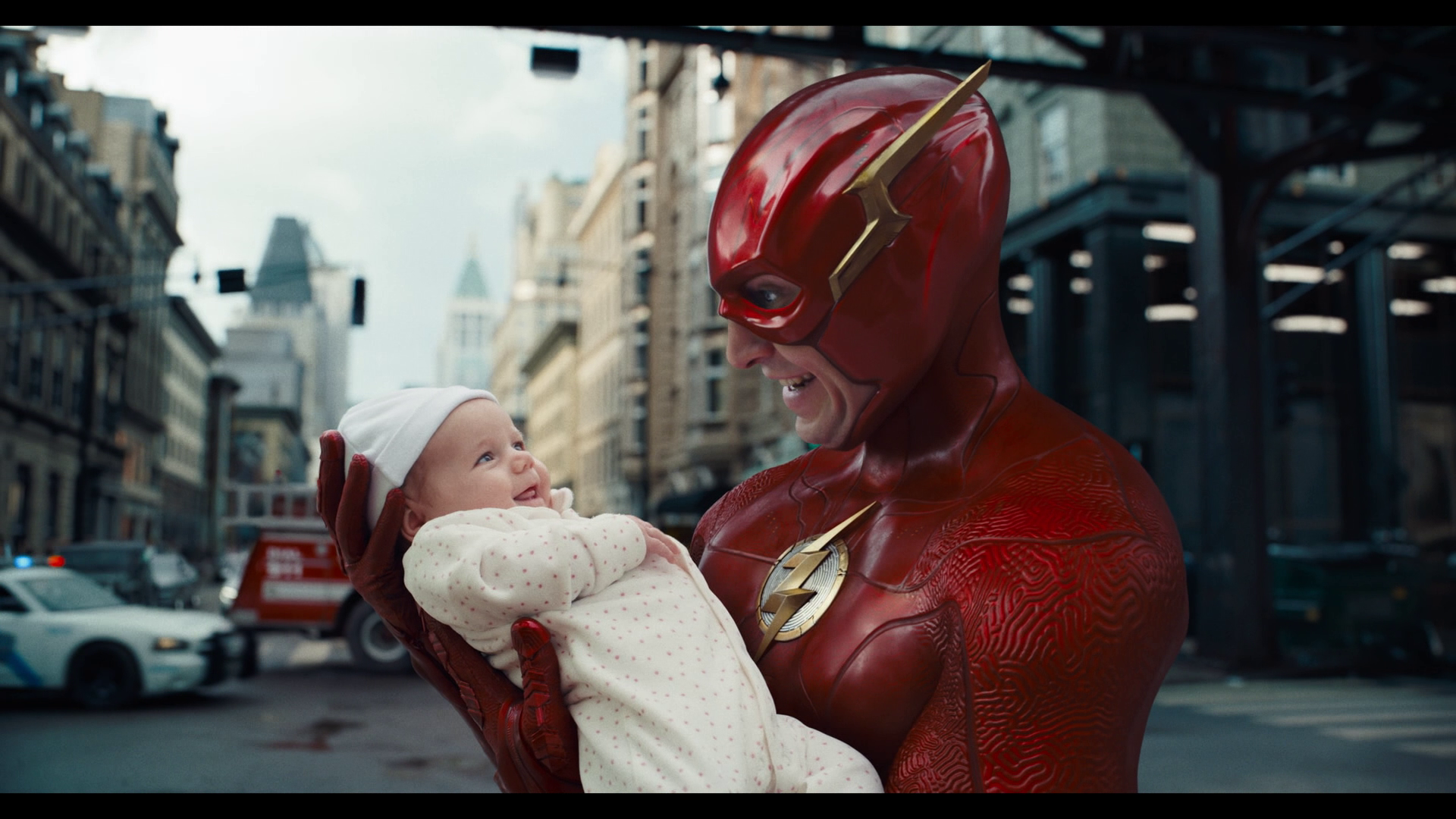 Maybe there was a big urban renewal project after Keaton’s Bruce retired? Or maybe the joke was supposed to be that Keaton’s Batman just carries a Gothic vibe, bringing the Danny Elfman theme and gnarled Anton Furst production design everywhere he goes. (John Francis Daley and Jonathan Goldstein worked on an early draft of The Flash and share story credit with screenwriter Christina Hodson, and I can absolutely see that being one of their contributions.) But it feels like the wrong kind of fan service – like an older action figure being mistakenly included in a more current collection – and given the way The Flash depends on the audience being familiar with literal decades of DC film and television adaptations, it’s a weird choice.