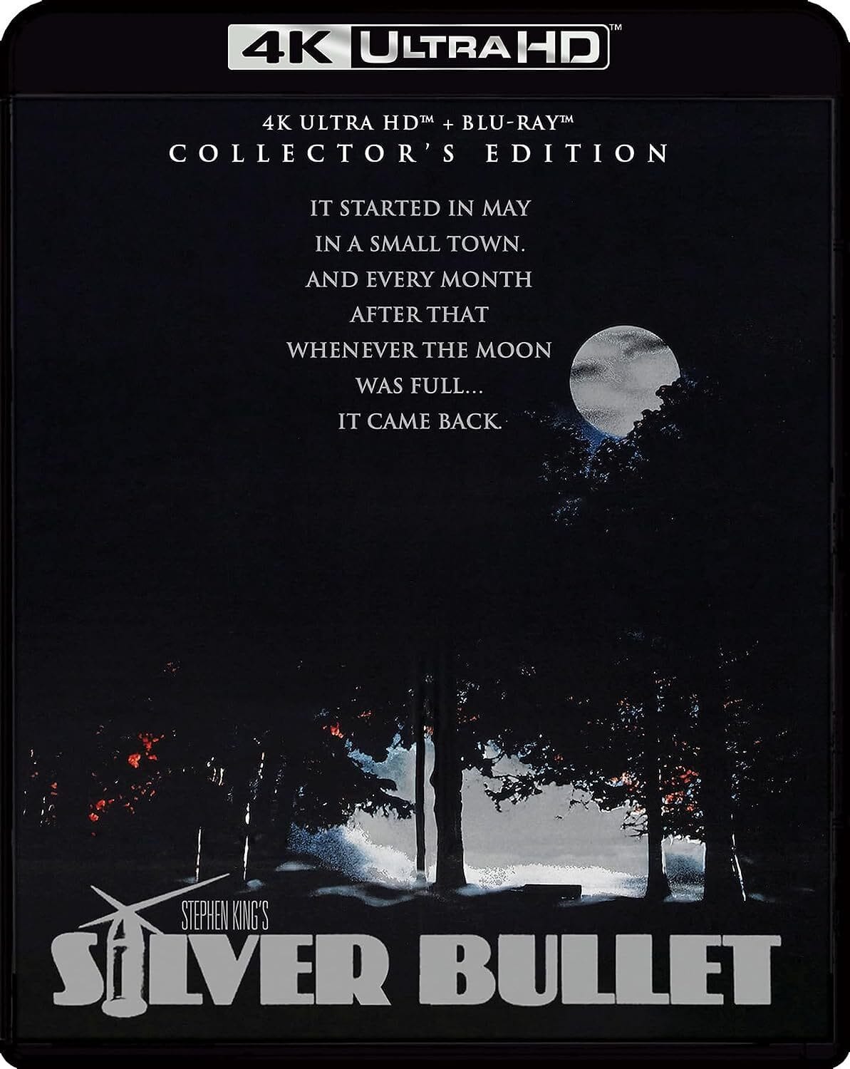 I’ll say this for Shout’s 4K release of Silver Bullet: Restored from the original camera negative, it looks cleaner and brighter than it has in decades, though that does have the unintended consequence of making the effects look cheaper and sillier than ever. The feature on the included Blu-ray disc has also been upgraded, and all the supplements produced for Shout’s 2019 special edition are carried over here – audio commentaries with director Attias and producer Martha De Laurentiis, an isolated score and audio interview with composer Jay Chattaway, interviews with McGill, co-star Kent Broadhurst and editor Daniel Loewenthal and a look at the effects. There’s also a new audio commentary with Eric Vespe and Scott Wampler of the Kingcast podcast. They get it.