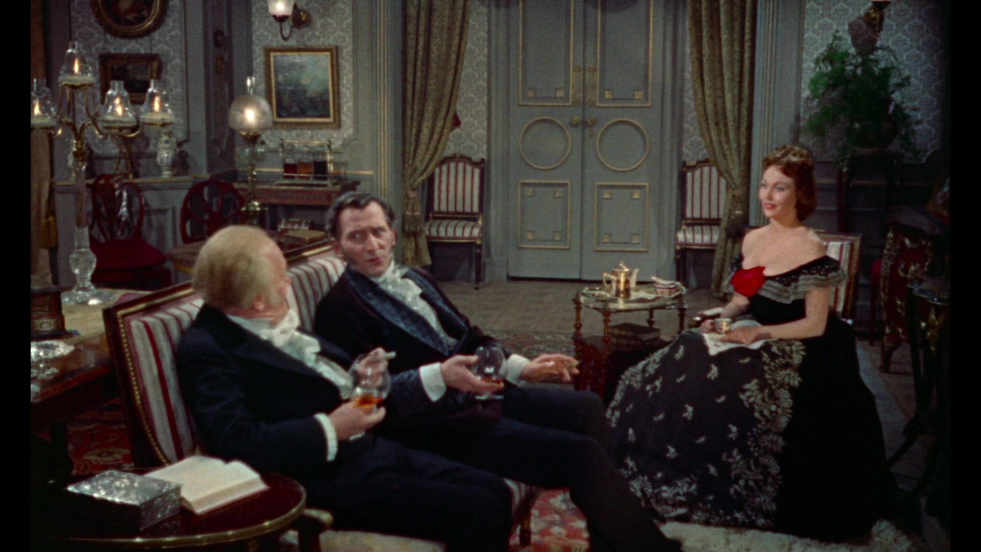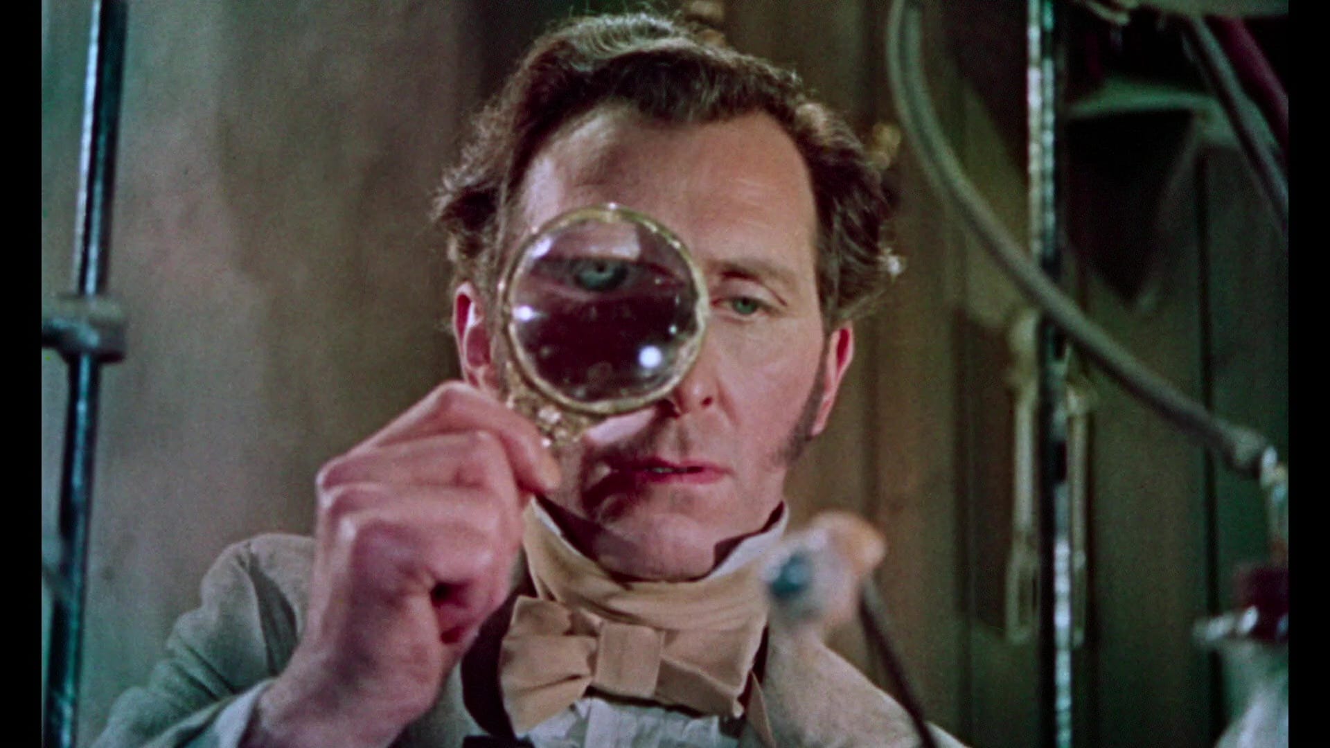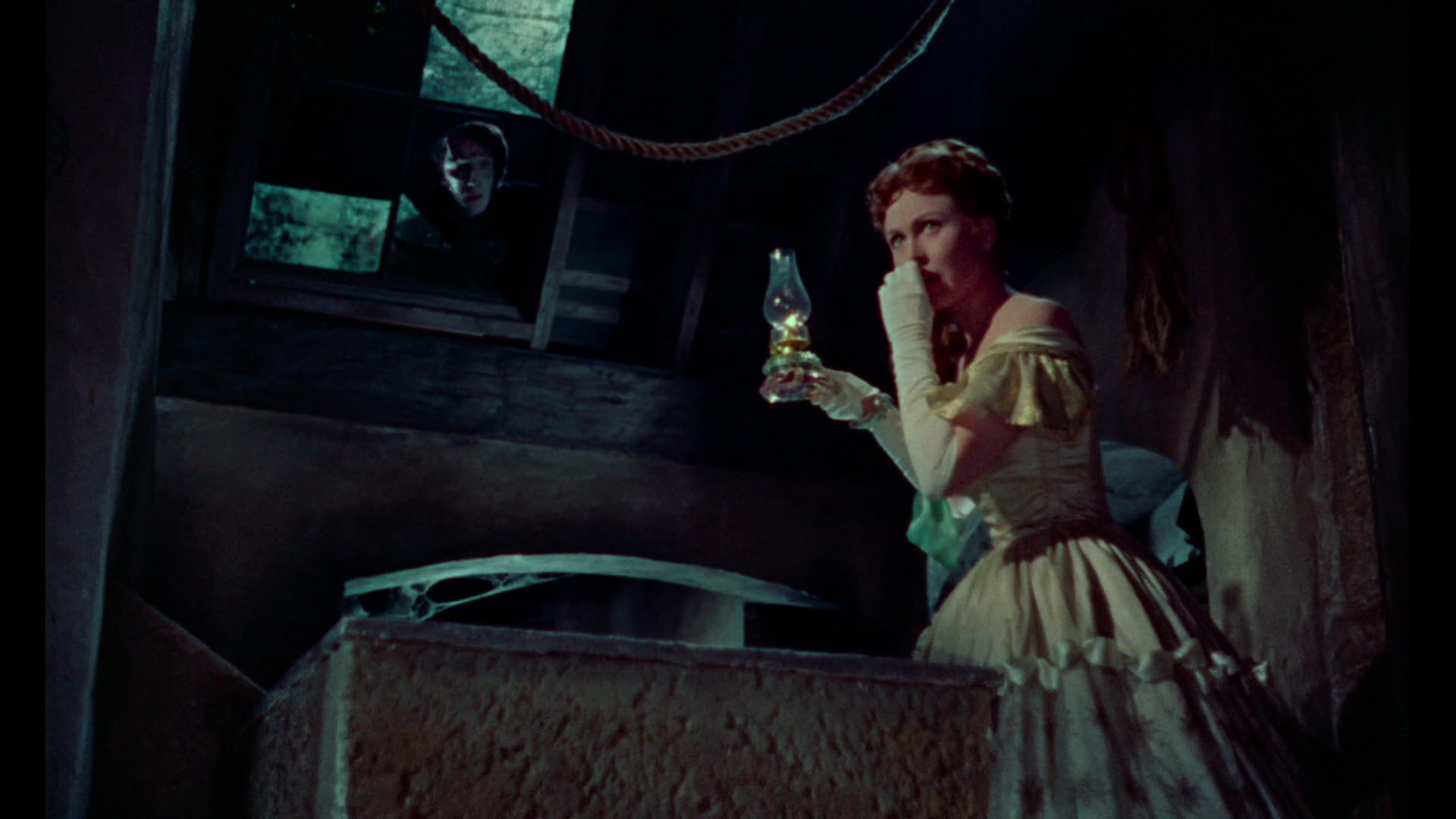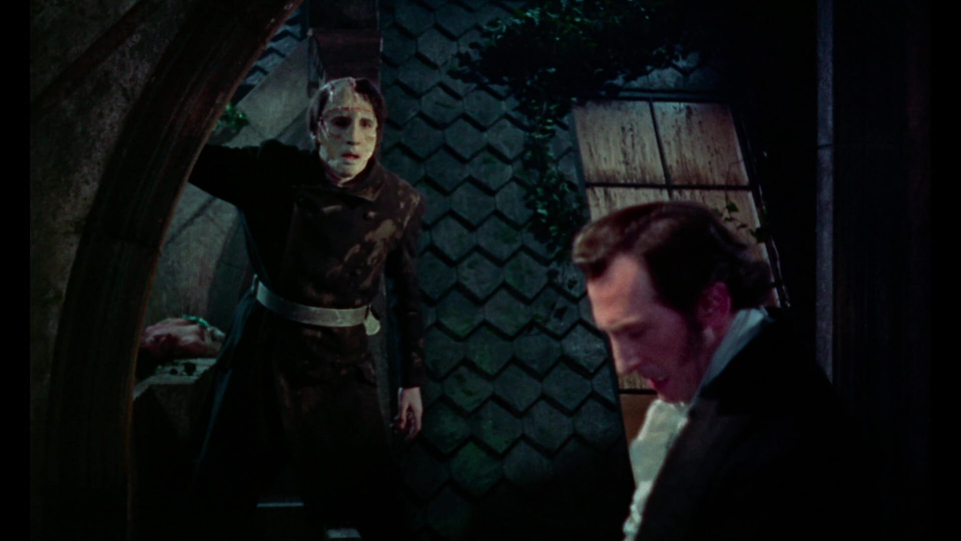 Arriving in theaters before exhibitors had fully figured out matted widescreen projection, The Curse of Frankenstein was screened in three different aspect ratios – matted to 1.66:1 in European cinemas and to 1.85:1 in US theaters, and screened full-frame at Academy 1.37:1 in older venues (and eventually on broadcast television). A featurette on the restoration makes a good case that, judging from elements in background paintings that would have been cropped out in the wider versions, the film was intended to be seen unmatted – but the wider versions do look pretty great.