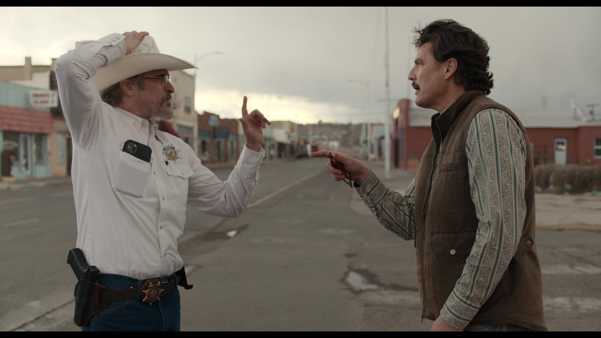 Pandemic or no pandemic, Joe is a stupid, stunted man; he loves flexing his authority as a lawman, delighting in small, petty insults and aggressions, and he cannot handle the slightest challenge to his alpha-male status. Phoenix is doing some great physical work here, stammering and huffing through a confrontation like Yosemite Sam – as though he’s battling the urge to pull his gun out and start shooting anyone who annoys him. That’s funny, until you remember Joe actually has a gun. A few of them, probably.