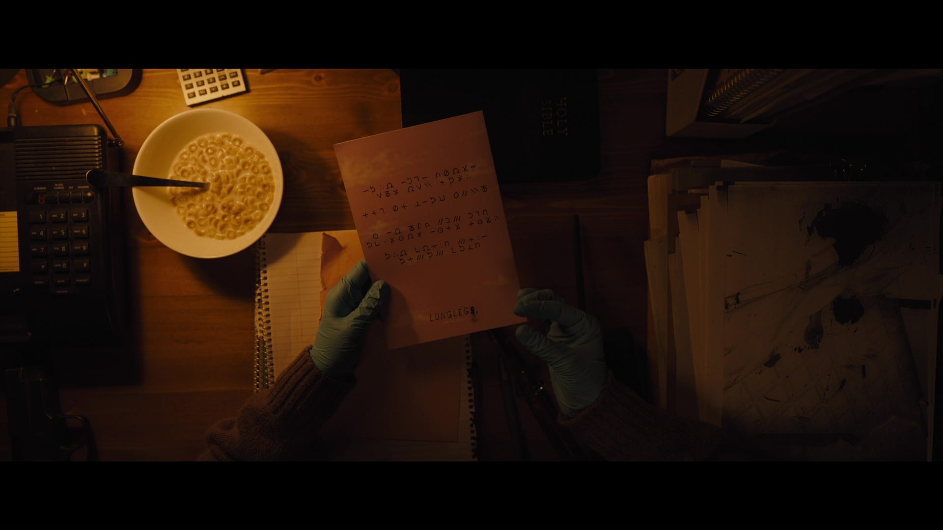The only thing they know about the killer, lead agent Carter (Blair Underwood) explains, is that he slaughters entire families without leaving any physical trace of his presence except for a letter, written in an untranslatable Zodiac-style cipher. But it always ends with a single word in plain English. A signature. Longlegs.