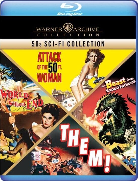 Same goes for the Sci-Fi set, which celebrates the 1950s trend of very large things stomping around while frightened people try to run in the opposite direction. It’s a fun mix, packaging the Archive discs of Attack of the 50 Ft. Woman and World Without End with the earlier Warner releases of The Beast from 20,000 Fathoms and Them! There aren’t that many colossi in World Without End – just some oversized spiders, really – but the heart wants what it wants, right?