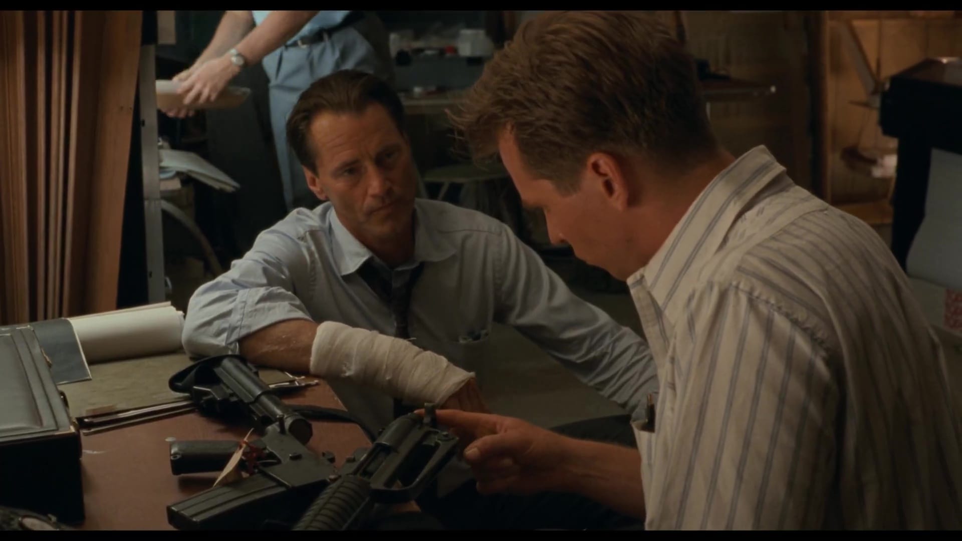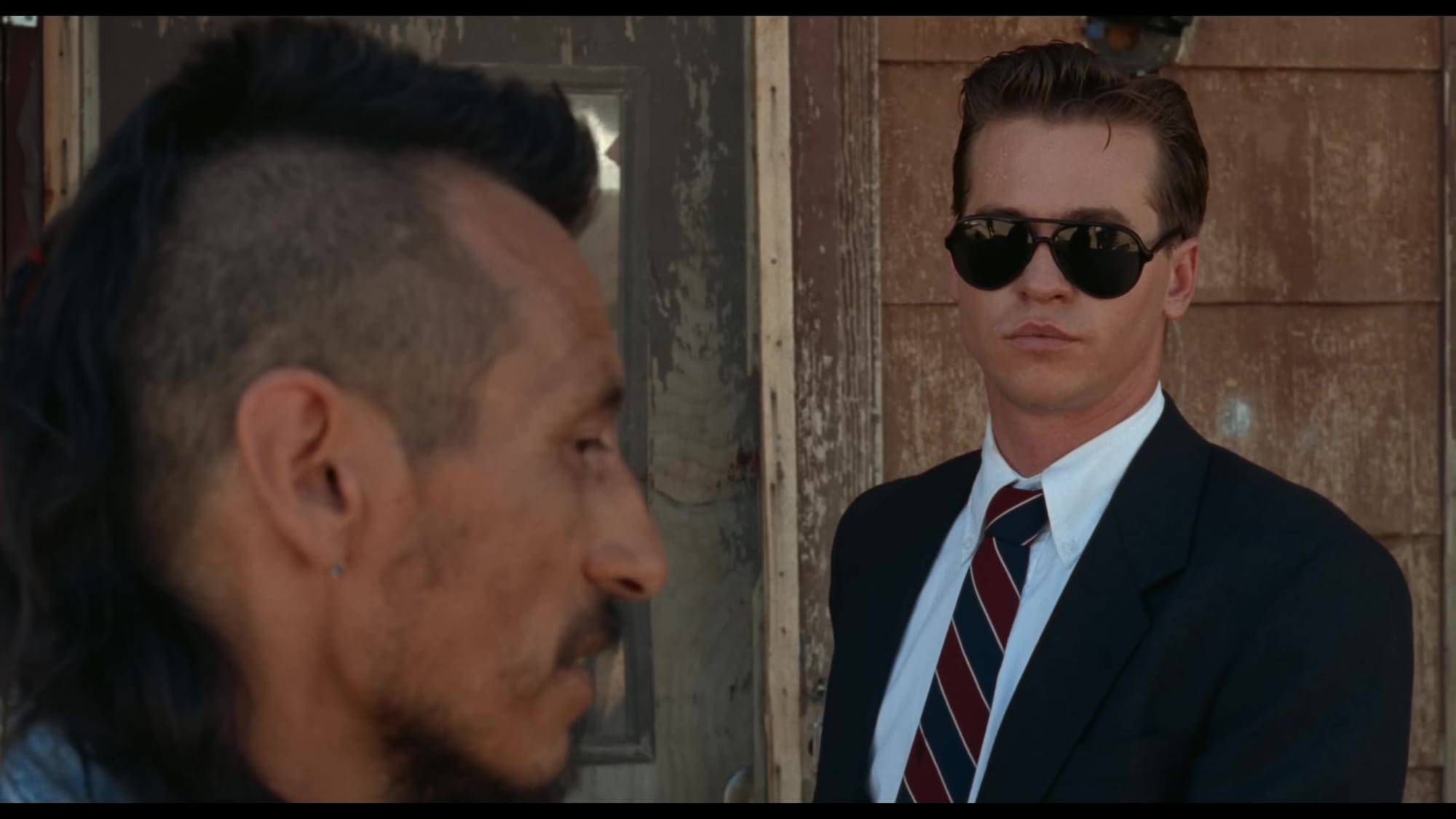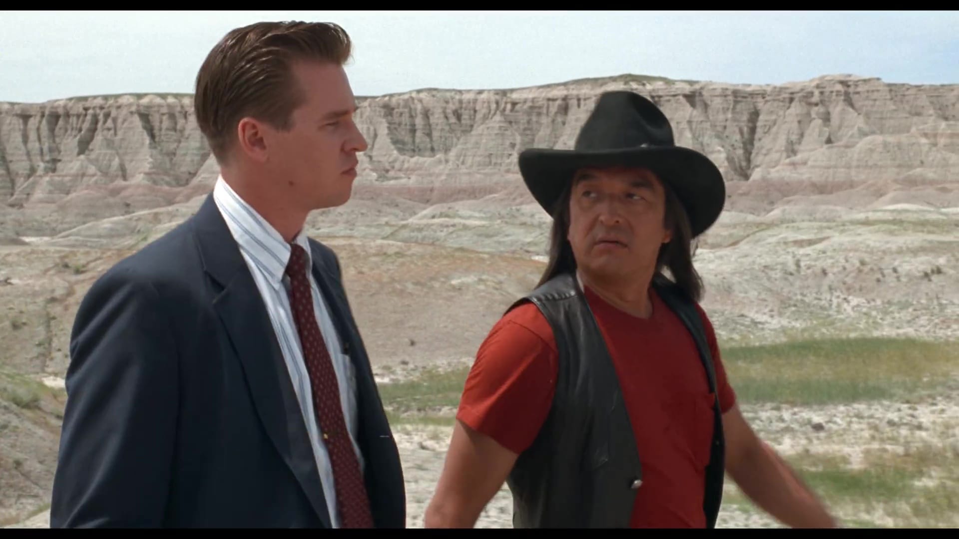Fusco’s script uses most of that as background, focusing instead on the spiritual reawakening of Val Kilmer’s part-Sioux agent Raymond Levoi as he attempts to solve a similar but legally distinct crime. AIM has been renamed ARM – the Aboriginal Rights Movement – and there are no dead FBI agents in this story, just a murdered member of the tribal council. The killing seems to be the result of tensions between the tribal elders and self-serving council president Jack Milton (Fred Ward), with just a couple of suspects, Maggie Eagle Bear (Sheila Tousey) and Jimmy Looks Twice (former AIM chairman John Trudell).